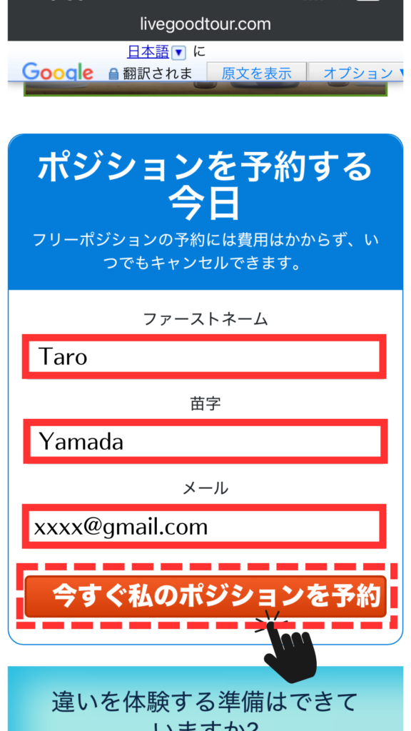 次に、名前、苗字、メールアドレスを入力して「今すぐ私のポジションを予約」をタップしてください。