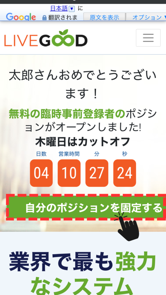 仮登録をした後に表示される画面から、自分のポジションを固定し、アフィリエイトの実施、報酬などが受け取れるように本登録をしていきます。「自分のポジションを固定する」をタップしてください。