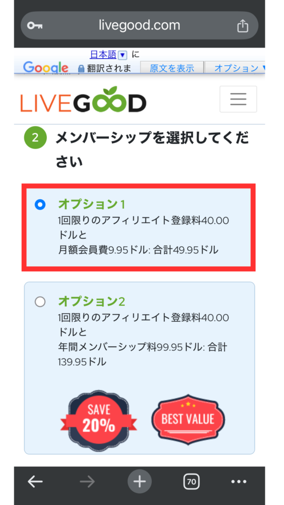 オプション①:1回限りのアフィリエイト登録料40.00ドルと、月会費9.95ドル